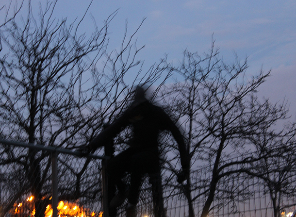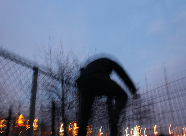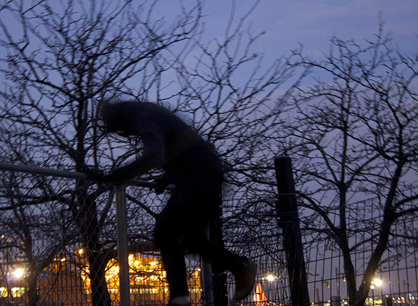 Recently, with our “New Dystopia” theme in mind, Marianne shared with us some photos Fleming had shot showing a nimble man in a wintertime puffer jacket climbing up and over a chain-link fence.