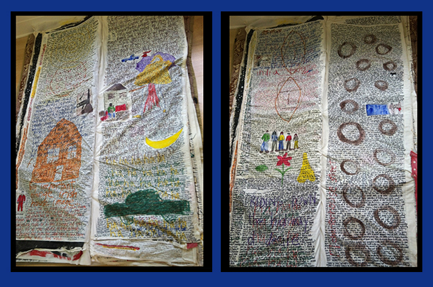 Chip Haggerty, pages from “Sleeping Bag Books,” no date, ink and acrylic paint on fabric; dimensions, two vertical panels: 72 x 36 inches (182.88 x 91.44 centimeters). Photos courtesy of the artist, from his website