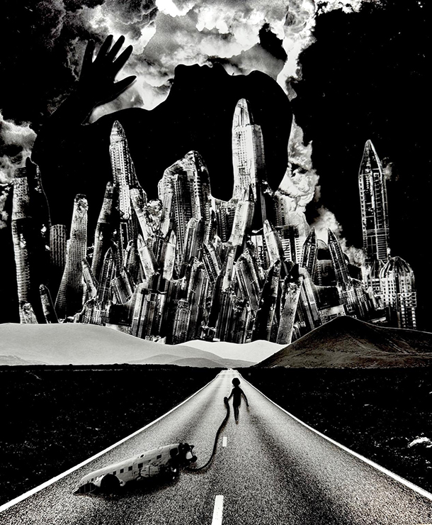 “The idea of a ‘new dystopia’ aligns closely with my collage-making, which responds to the surreal, fractured reality we now inhabit.”