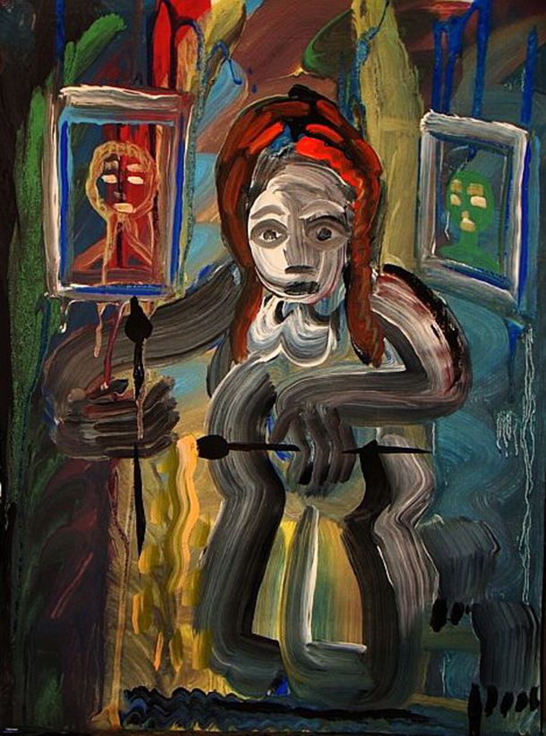 A painter who prefers to allow the pictures she conjures up to speak for themselves, whatever they might have to say or whatever viewers might discern in and take from them, Realm shared with us a batch of images whose titles hint at what she has been thinking about the state of the world today. Here are a few of them.