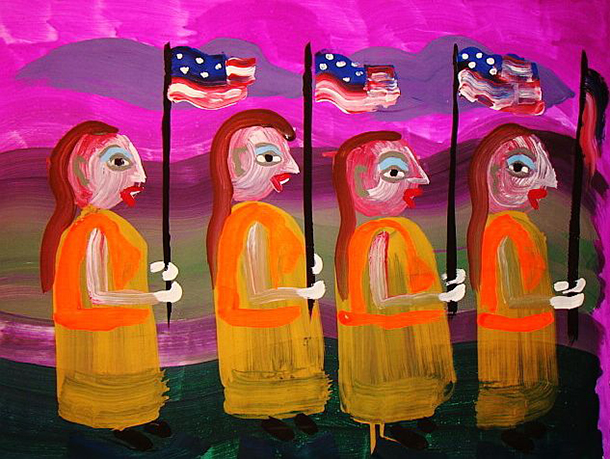 Alma Realm, “Protesters March,” 2025, gouache on primed paper, 18 x 24 inches (45.72 x 60.96 centimeters). Photo courtesy of the artist