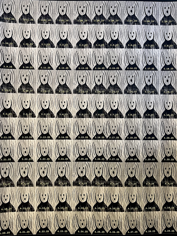 Emily Waters, “100 Days of Horror,” rubber stamps on silver paper, with treatment using Adobe Photoshop, 24 x 18 inches (60.96 x 45.72 centimeters). Photo courtesy of the artist