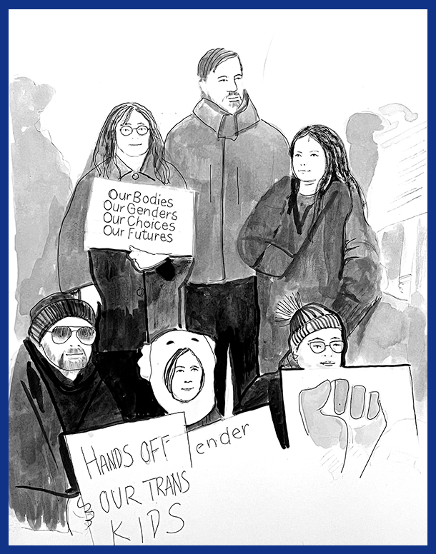 “The next weekend, I went to a rally at Union Square, where I watched kids speak for themselves. They spoke eloquently about their right to exist. They don’t need anything from us except to be heard and respected. Stand back, vultures — don’t trample on trans kids’ rights!”