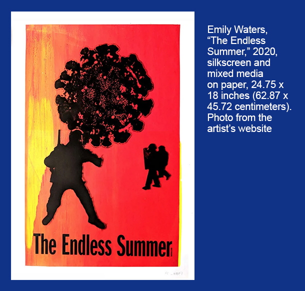 About this work from 2020, Emily Waters says, “This was my response to the murder of George Floyd and to COVID. It’s a take on the 1966 documentary film The Endless Summer, in which two surfers from California travel the globe to surf all summer long. Unlike those surfers, however, in the U.S.A., we were experiencing a summer that was cruel, full of police brutality, and, as it was around the world, also full of COVID.”