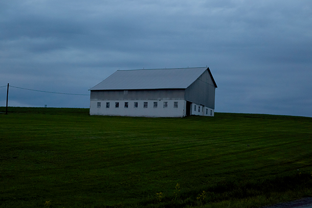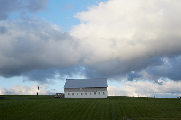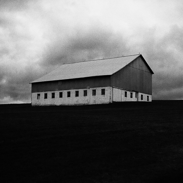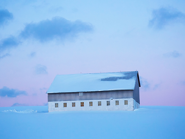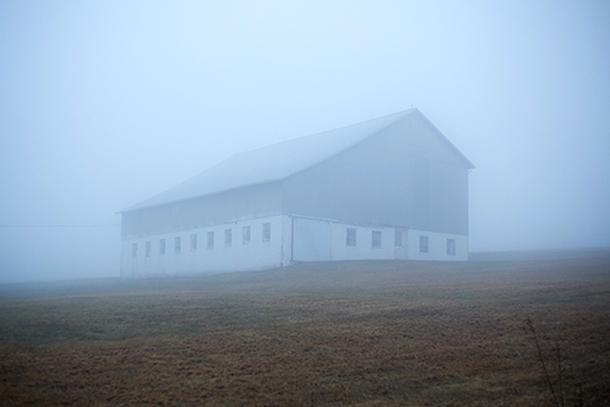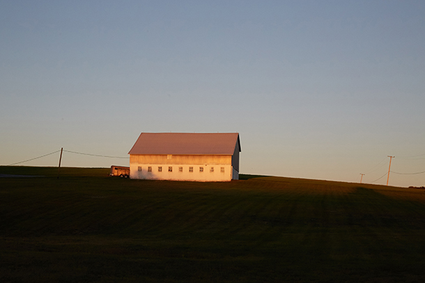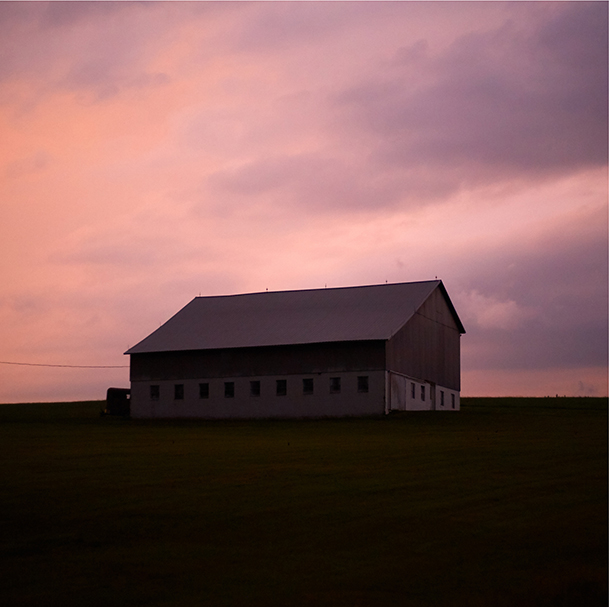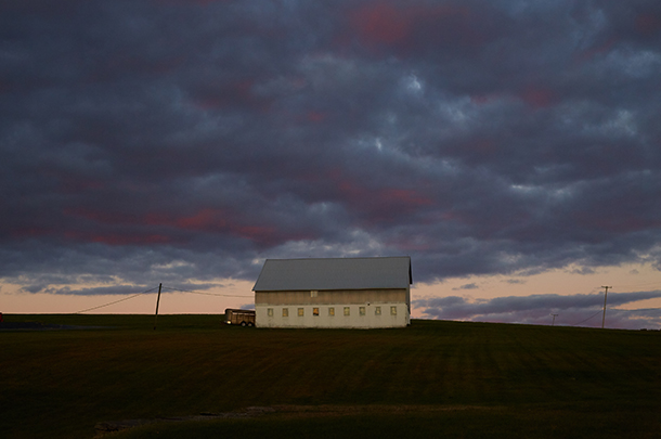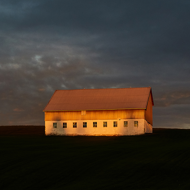 From time to time, Bill has traveled to northeastern Pennsylvania, where, in one area near the Delaware River, which serves as the border with New York State, a certain large barn routinely has caught his eye. Bill has seen it during different seasons of the year and at different times of the day. When he first discovered it, as much as he appreciated its unadorned, minimalist form sitting atop a hill, it was the light that fell upon it — and that, simultaneously, appeared to emanate from it — that seized his imagination.