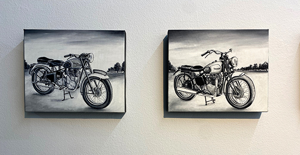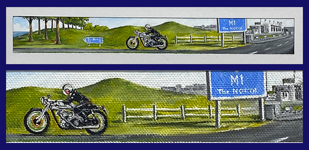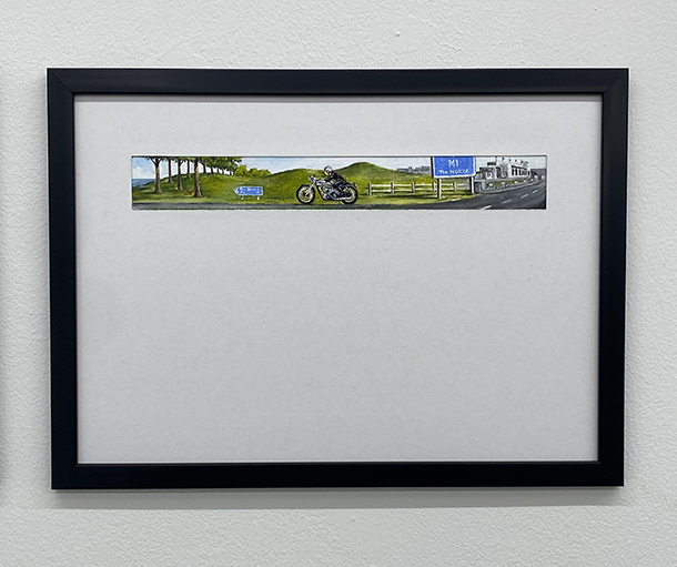 About these small paintings, he told us, “I had started making some miniatures inspired by the Scottish poet Robert Burns’ verses, and also some landscapes of Scotland, at which point I decided to paint the landscapes in color. When I was preparing work for this exhibition, I took a cue from a scene from ‘The Leather Boys,’ a British biker movie from 1964, in which someone suggests going on a ‘burn-up’ to Edinburgh. So I decided to paint a linear narrative depicting the journey from the Ace Café in London, a legendary bikers’ hangout, to Edinburgh Castle. Because I had been doing the miniatures in color, I thought I’d continue using color for this new series.”