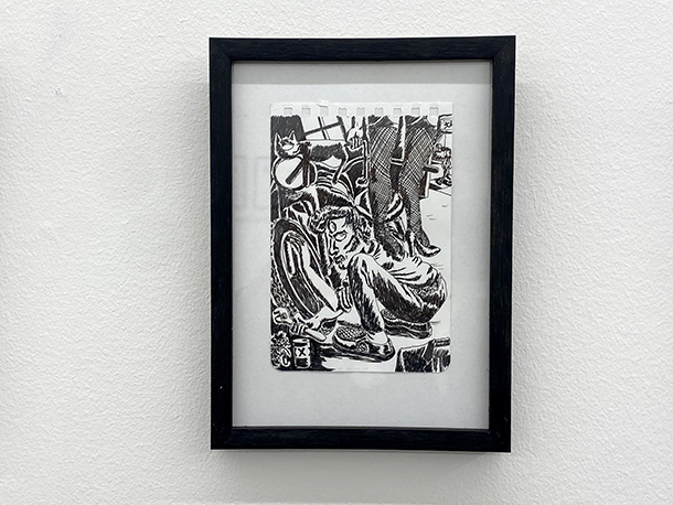 A centerpiece of the current Tokyo exhibition is McLean’s painting “1000 Rockers, One Fuckin’ Bike” (2021), featuring a gathering of 1000 rocker-biker skeletons, most outfitted in black-leather jackets and sporting riding goggles. This large work, which is about 2.5 meters (roughly 8.2 feet) wide, was partly inspired, McLean has said, by the Clash bassist Paul Simonon’s exhibition “Wot No Bike,” which was shown at the Institute of Contemporary Arts, in London, in 2015. It featured that musician-artist’s paintings and linoleum cuts of such biker accoutrements as leather jackets, gloves, and boots, as well as goggles, helmets, and motorcycles.