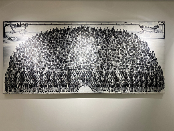 In the group’s song, “Garageland,” McLean pointed out, the Clash sing, “Twenty-two singers, one microphone. […] Five guitar players, one guitar.” Remembering that song, he said, “Thinking about it, at that point, I had the idea for my painting, and it’s title came easily: ‘100 Rockers, One Fuckin’ Bike.’” However, he explained, “I made some rough sketches and then started working on the underdrawing on the canvas, but after sketching 100 rockers, I realized they weren’t enough. Half of the canvas was still empty, so I decided that my title would have to be ‘1000 Rockers, One Fuckin’ Bike!’”