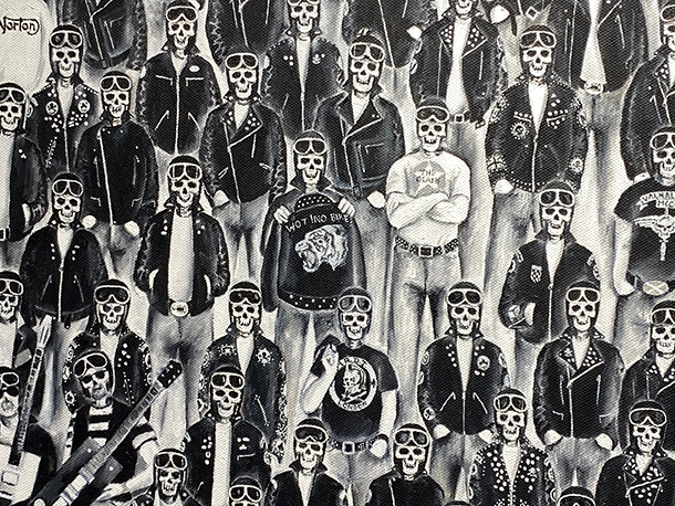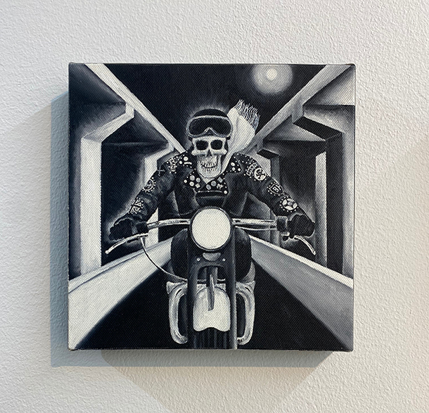 The artist’s subject matter vividly reflects the emblems and elements of his passionately imagined tribe: motorcycles, leather jackets, cool-guy vibes, rock’n’roll attitude (especially of a punk-flavored strain), and the enduring, mythical allure of the open road. Throw in a fondness for haunted-house imagery — skeletons and skulls and cross-bones, keeping in mind that the latter motif has long been associated with biker culture — and a sense of humor that is somewhere beyond offbeat.