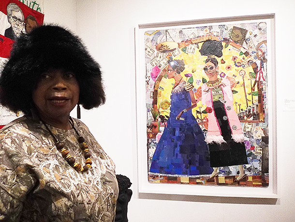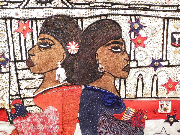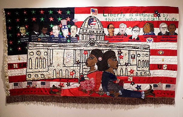 This large-scale, mixed-media work, titled “Them! Us!,” is Della Wells and Anne Marie Grgich’s collaboratively produced “quilt,” as they call it; this thematically ambitious, timely creation offers a knock-out spectacle of meticulous needlework and fabric-based collage-making.