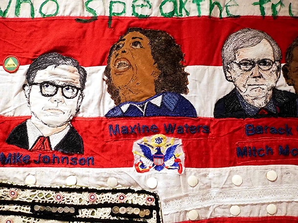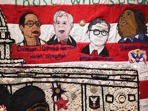 As far as its subject matter is concerned, as it uses the Stars and Stripes as its background and, technically speaking, its support surface, “Them! Us!” recalls and depicts a number of well-known figures from U.S. political history as a way of referring, in shorthand, to the pageant of American democracy’s evolution over more than two centuries. Among them: Richard Nixon, Shirley Chisholm, Eleanor Holmes Norton, Maxine Waters, and even Mike Johnson, Donald Trump’s lapdog Speaker of the U.S. House of Representatives.