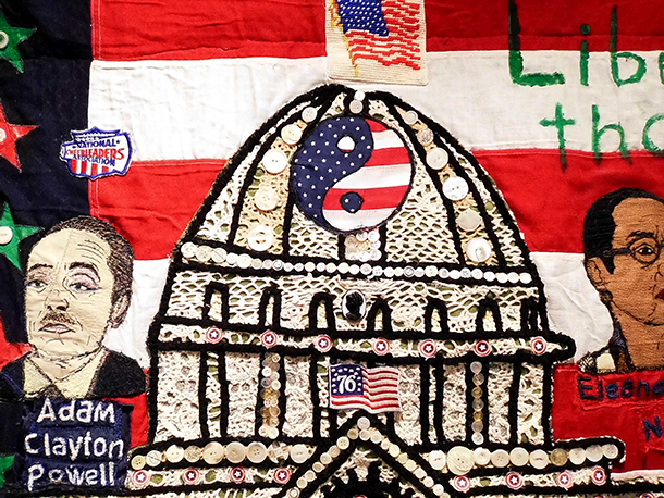 Against such a historical backdrop, and within the colorful, exciting setting of the giant, burst piñata that is the Outsider Art Fair, there is one big, bold, new artwork on view that dares to stand back from the fiesta to take the measure of the current moment of uncertainty and anxiety, even as it does so with humor, sass, and charm. It’s a work of art that refers to American political history without functioning polemically or in a propagandistic manner. It’s at once sophisticated and clever, and superbly well crafted.