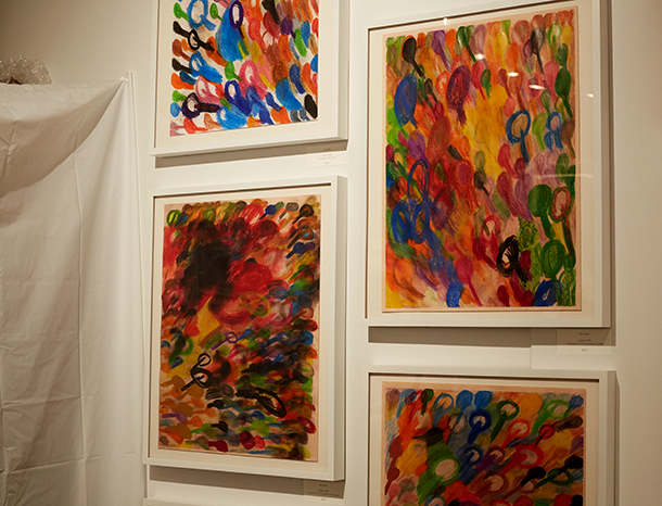 In the booth of the Center for Creative Works, an organization that operates two art-making workshops for disabled people in the Philadelphia area, the brightly colored abstractions in colored pencil on paper of the artist Billy Bolds feel irrepressibly joyous.