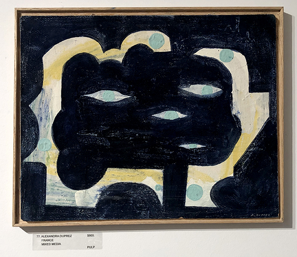 Pulp, a gallery based in Holyoke, Massachusetts, is presenting a handful of small, abstract works by the artist Alexandra Duprez (born 1974), who is based in France. Duprez was expelled from a university at which she was studying when she was 20 years old. She threw herself into her art-making, creating abstract compositions that feel mysterious, as though they’re revealing their messages with hesitation through their layers of overlapping colors and abstract or silhouetted human forms. In her palette, black, dark blue, and scarlet red play prominent roles.