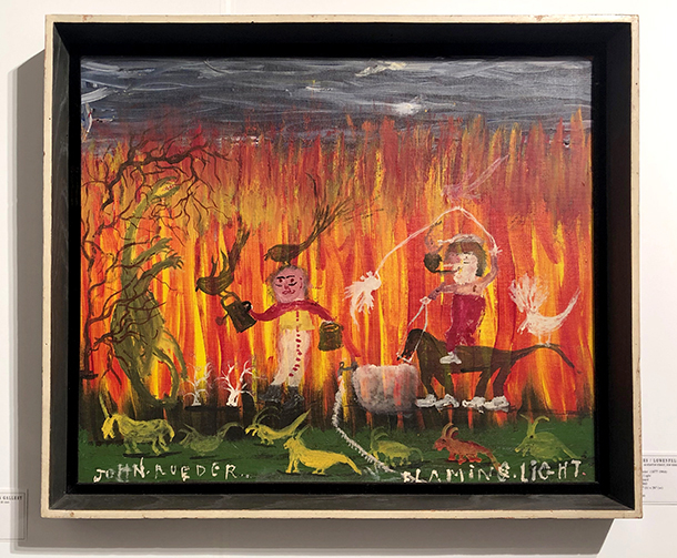 Titled “Flaming Light,” it’s a picture in oil on board by John Roeder (1877-1964) featuring a man on a horse — or a big, long-tailed dog with white feet resembling chunky sneakers? — and a woman with a watering can (large birds are perched on the can and on her head) standing in front of a row of tall-growing plants. Are they burning corn stalks? Roeder’s entire composition seems to be deliciously on fire. Feel the heat!