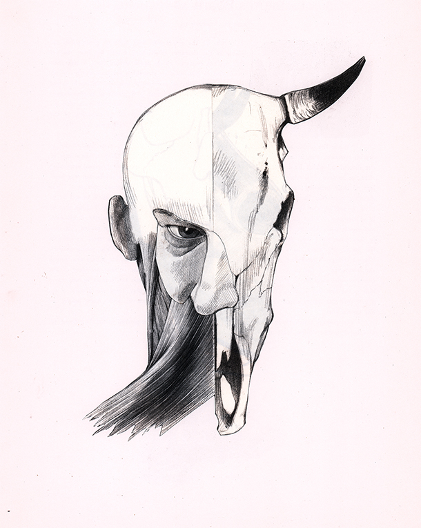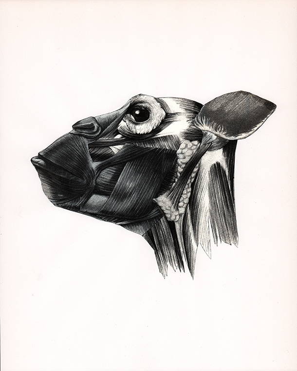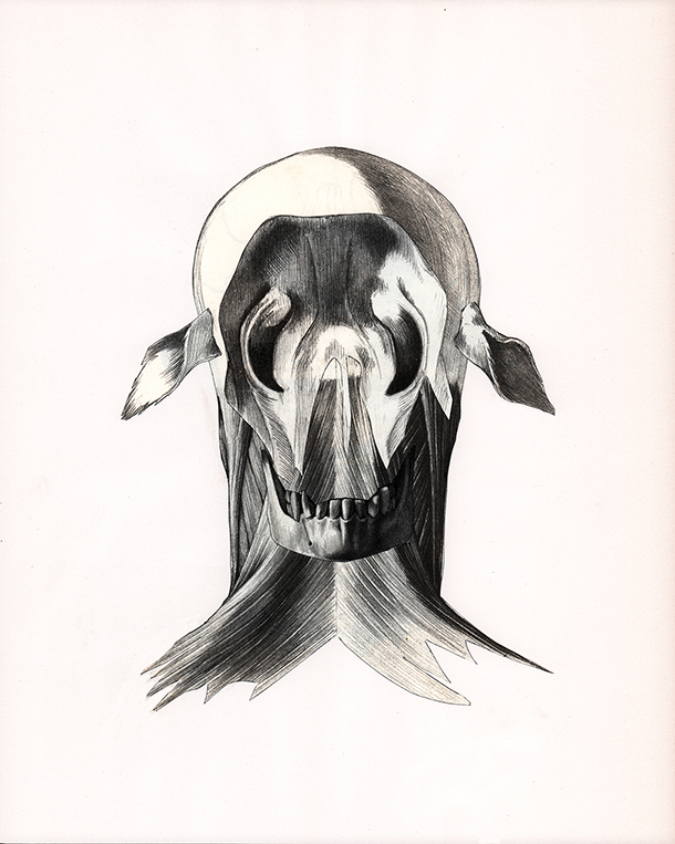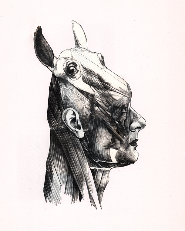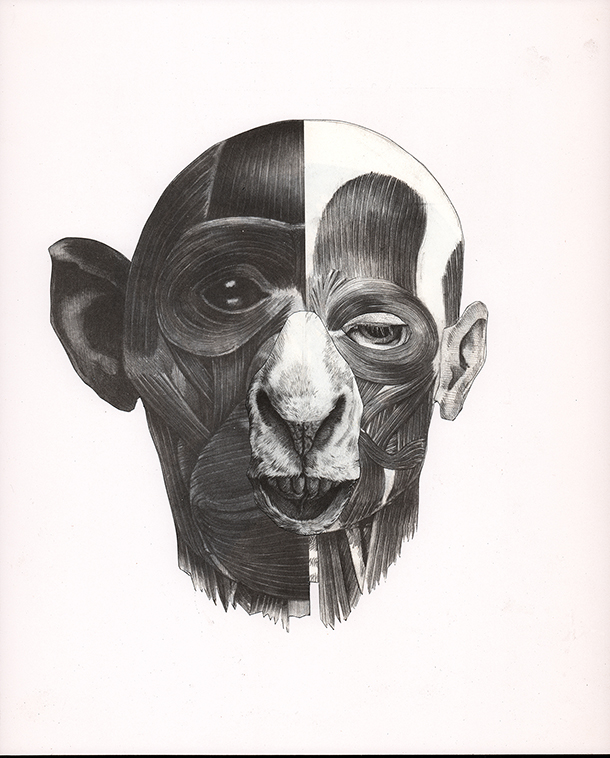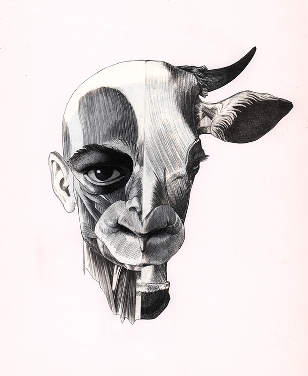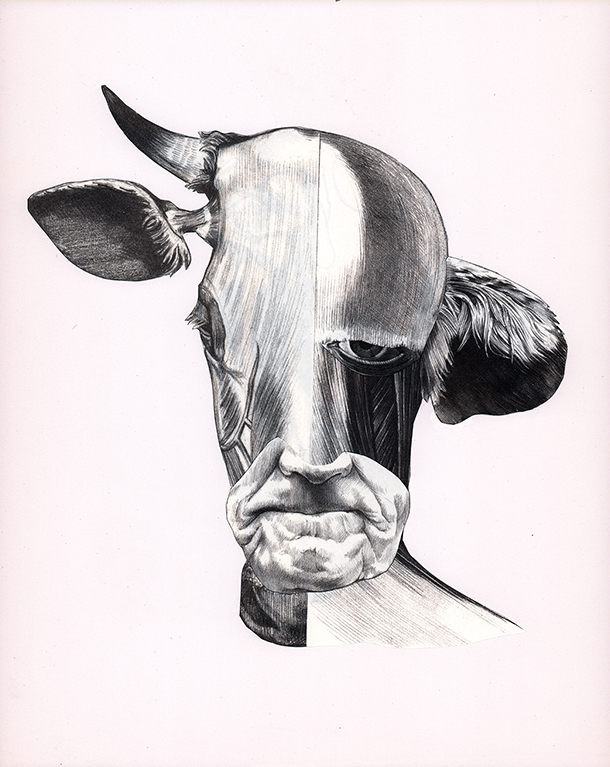 The eeriness of Plumadore’s “Species” critters, which combine both recognizable human and animal features, is their allure. (They were made from anatomical illustrations that were executed in pencil and then reproduced in print.) In one of the new collages, for example, a mostly bovine head is marked by a man’s fleshy, chin and curled lips. In another, a human eye and ear emerge from a horned animal’s skull.